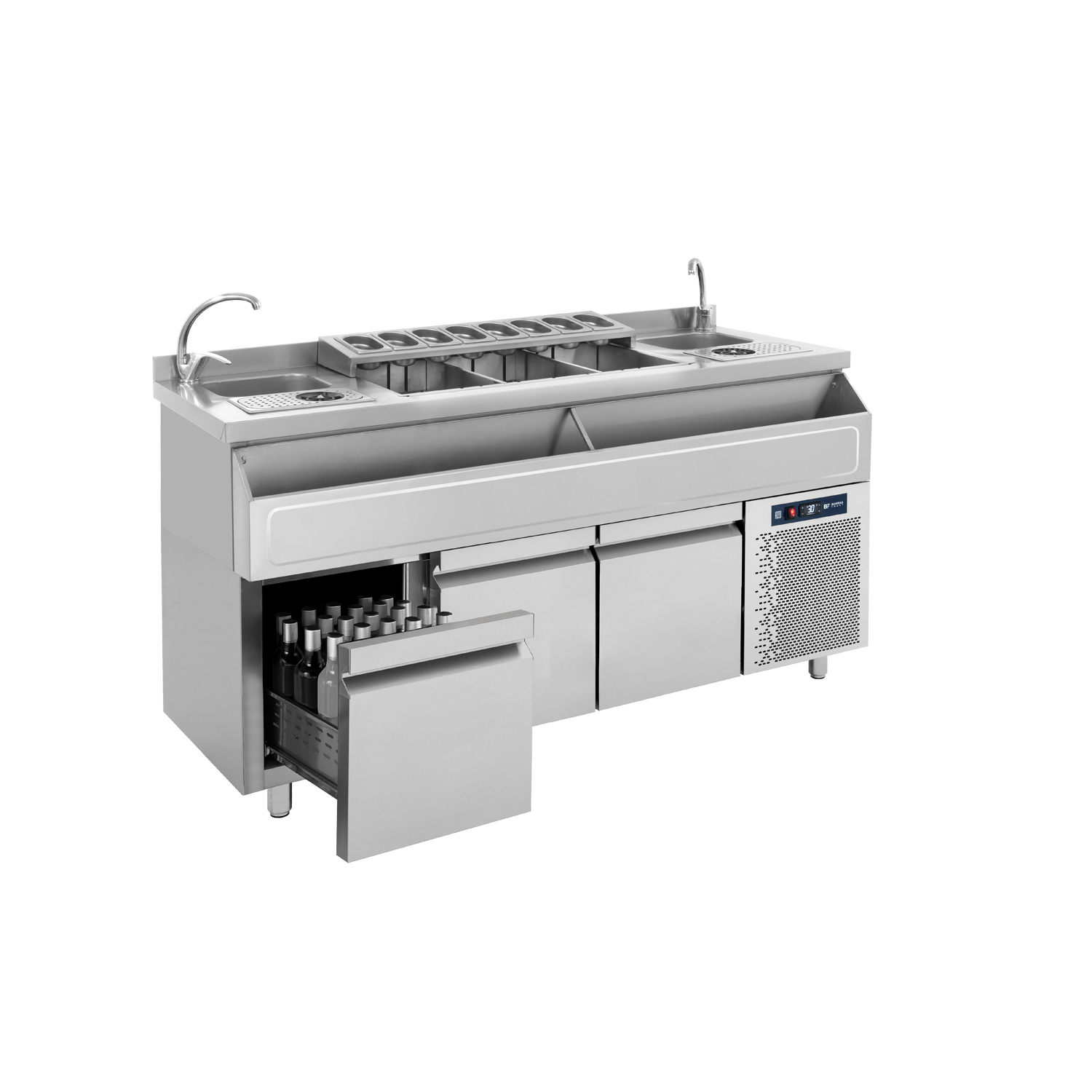 Κατασκευασμένο από ανοξείδωτο χάλυβα 304L Μονωμένη λεκάνη πάγου Δυο διαχωριστικά λεκάνης πάγου με δυνατότητα αλλαγής θέσης Όλα τα εξαρτήματα της λεκάνης πάγου είναι αποσπόμενα για εύκολο καθάρισμα Βάση για λεκανάκια GN 1/9 αποσπώμενη Σήκωμα στο καπάκι Θήκη για μπουκάλια αποσπώμενη για εύκολο καθαρισμό 2 Γούρνες 24Χ30Χ15 2 Ρινσερ νερού Μόνωση με οικολογική πολυουρεθάνη πάχους 5 cm Στοιχείο βαμμένο με αντιδιαβρωτική προστασία Συρτάρια GN για μπουκάλια Φρέον οικολογικό