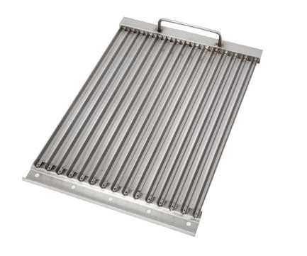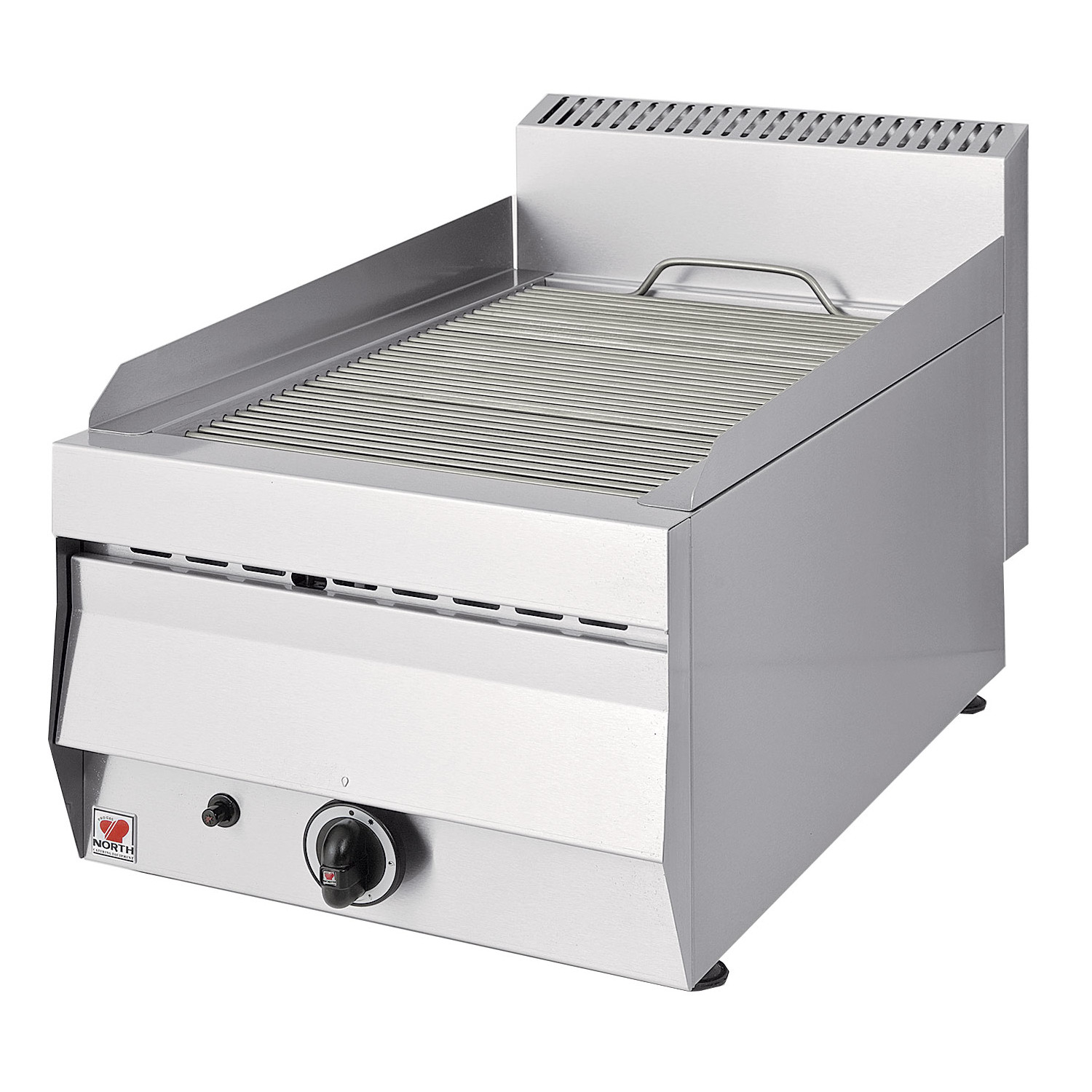 Επιτραπέζια σχαρίερα αερίου με συρτάρι νερού. Χάρη στους στιβαρούς και ισχυρούς σε ισχύ ανοξείδωτους καυστήρες η επιφάνεια ψήσεως είναι έτοιμη σε μικρό χρονικό διάστημα προς χρήση.